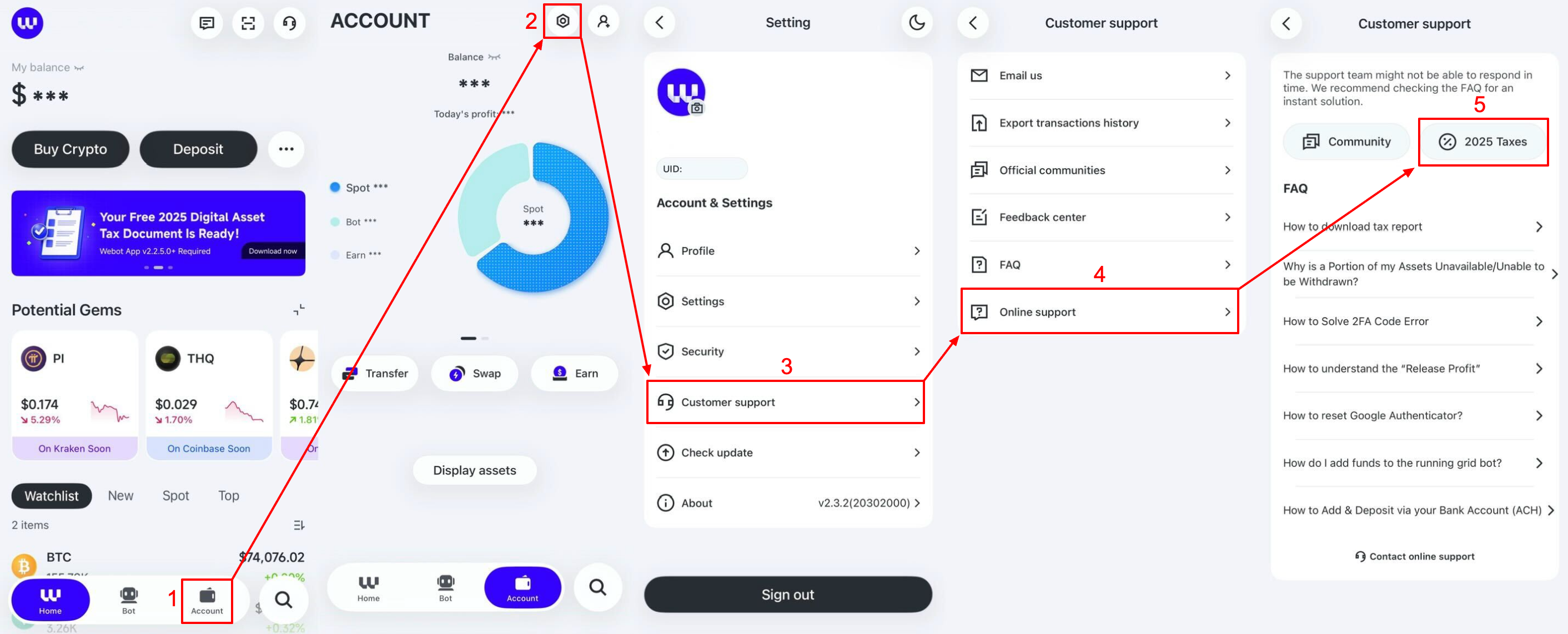1. After logging in, click on [Account], then the [Settings Icon], followed by [Customer Support], then [Online Support], and finally [2025 Taxes].