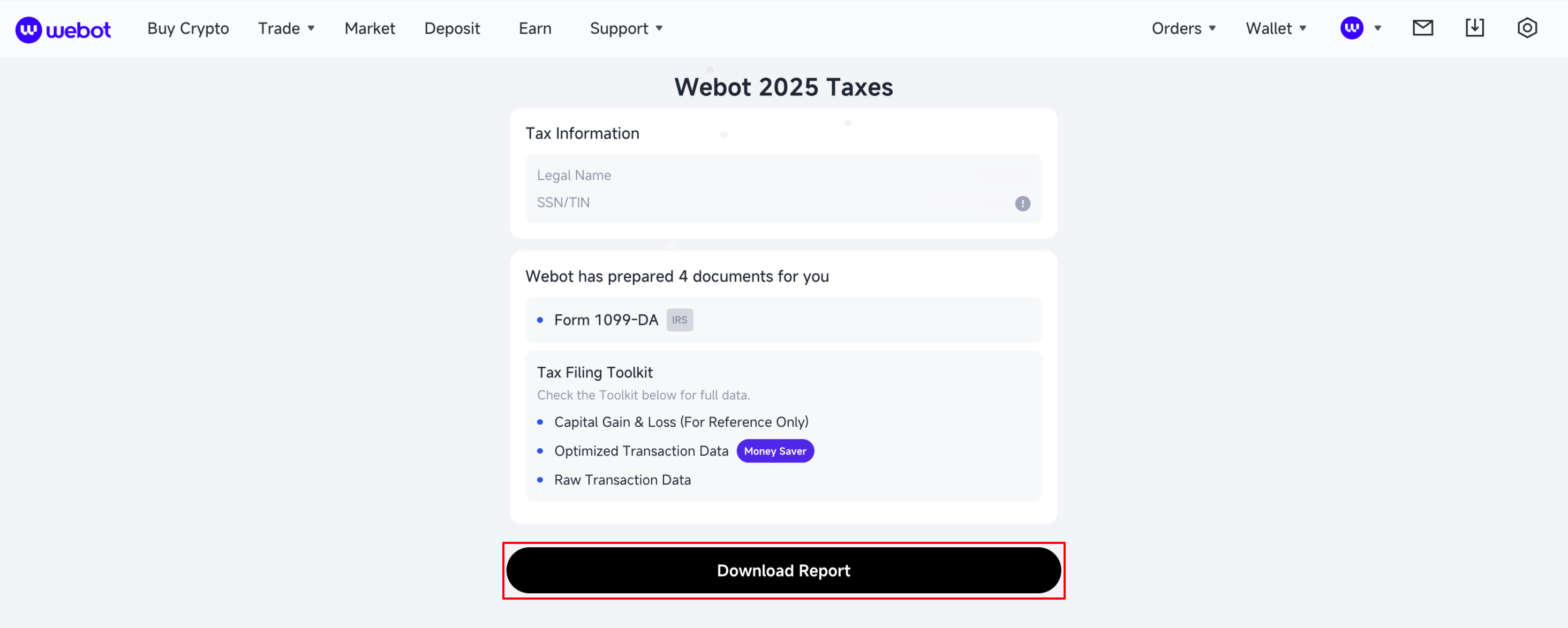 *Note: The tax report includes four documents: Form 1099-DA (IRS), Capital Gain & Loss (For Reference Only), Optimized Transaction Data, and Raw Transaction Data.